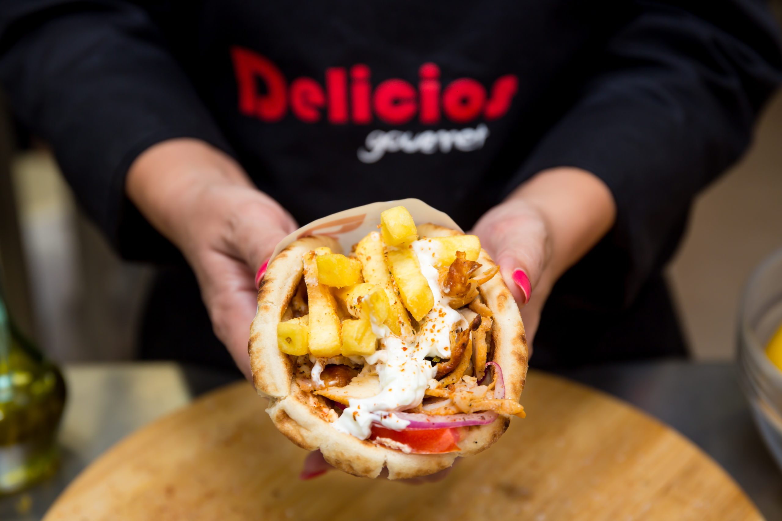 PITĂ GRECEASCĂ* 120 GR, CARTOFI PRĂJIȚI* 70 GR, CARNE DE PUI PREPARATĂ*130 GR //CARNE DE VITĂ PREPARATĂ* 130 GR//