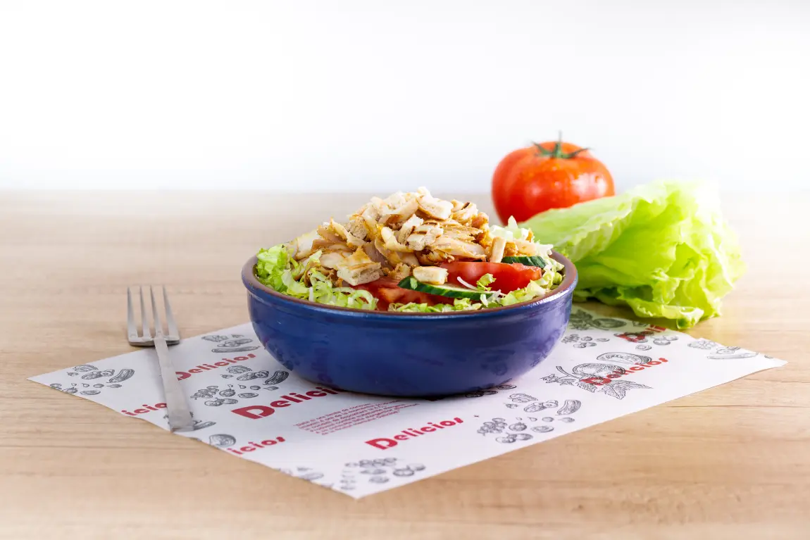 CARNE DE PUI PREPARATĂ* 150 GR, MAIONEZĂ CU USTUROI 30 GR, SALATĂ VERDE 70 GR, ROȘII 130 GR, CEAPĂ 30 GR