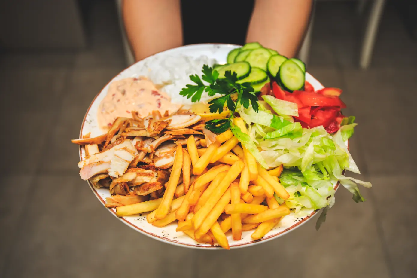 GREEK PITA* 90 g,FRIED CHICKEN MEAT* 170 g/ FRIED BEEF MEAT* 170G/ CHICKEN&BEEF MIX MEAT* 174 G, FRIES* 100 g, TZATZIKI 40 G, CHESSE CREAM 30 G, TOMATOES 30 g